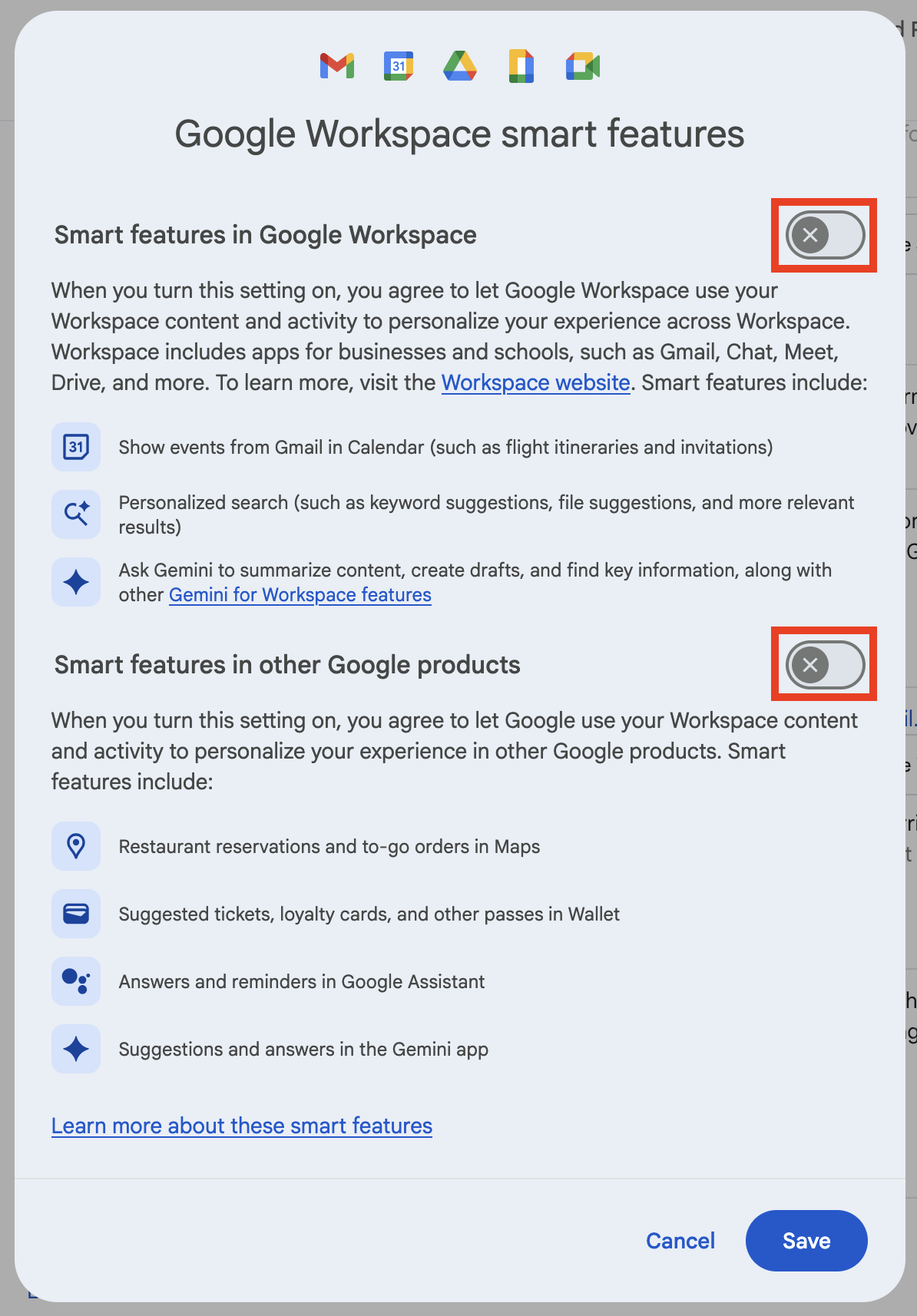 - Toggle off: ‘Smart features in Google Workspace’ and ‘Smart features in other Google products